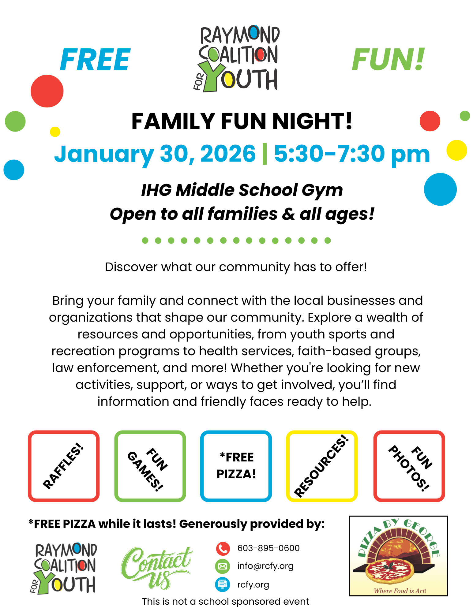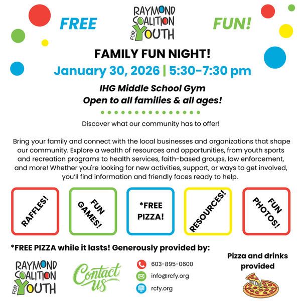Family Fun Night started in 2004, as an idea from a local youth who was tired of hearing that Raymond had nothing to offer. He suggested we start showcasing all of the great things that our town has, and the services and opportunities that are provided. These are our Town's assets and opportunities that are provided to our youth and families, and we want to make sure they know about them. Family Fun Night is a great opportunity to do just that! We have room for approximately 30 agencies, providers and establishments, to share information about their services and programs.