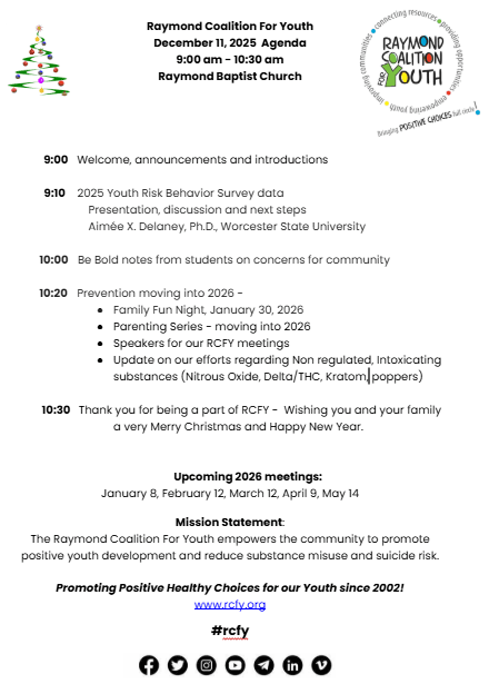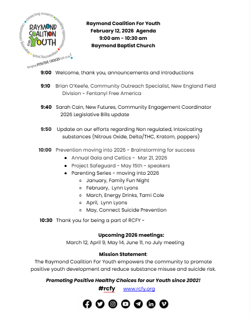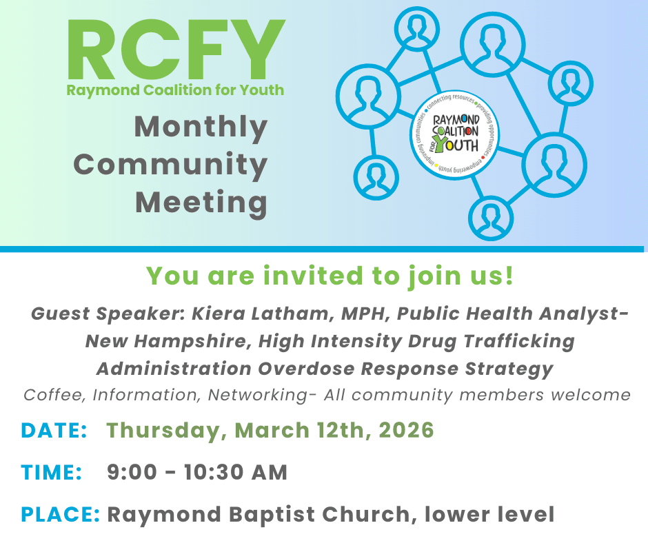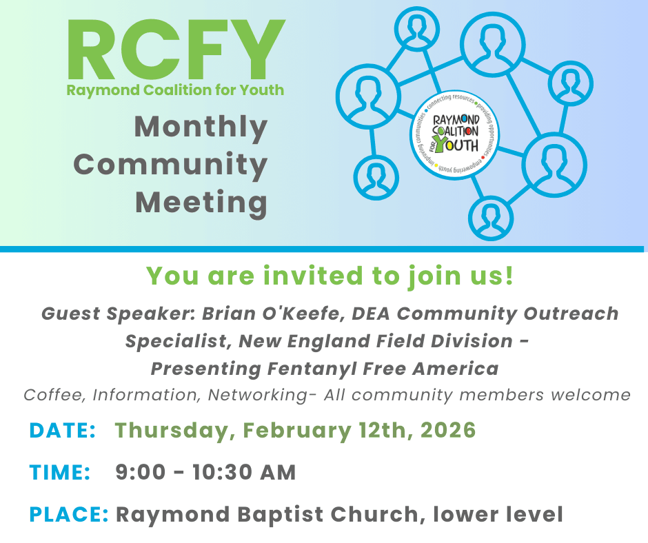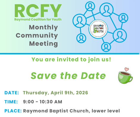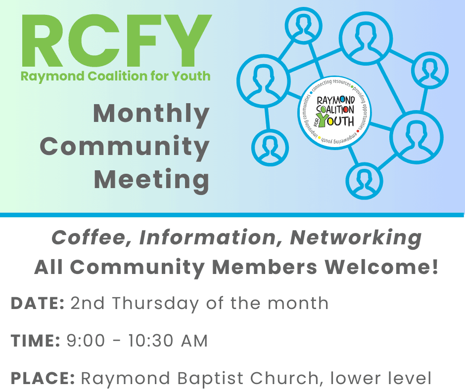 Do you care about our young people and creating a better community for them to thrive in? If so, you are invited to join us at our Raymond Coalition for Youth monthly networking meetings. RCFY is our community working together and includes: participants from the community, schools, law enforcement, healthcare, media, town government, youth-serving organizations, youth, and parents, who all come together to learn about new trends, brainstorm new ideas, and share knowledge of available programming, networking opportunities, and services.
